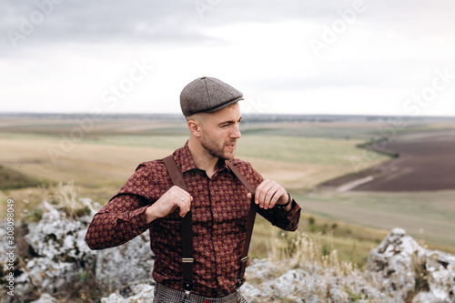Portrait of smiling man in shirt, cap and suspenders, who sits on the rock top of the hill. A man pulls suspenders. Beautiful landscape on background. Concept of suspenders advertising