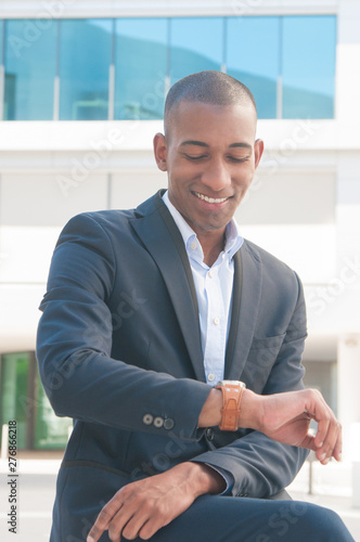 Portrait of smiling young businessman looking at watch. African American manager sitting at office building checking time. Punctuality concept