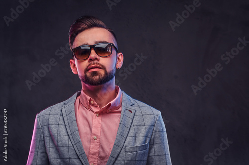 Portrait of styilish proud man in checkered blazer, pink shirt and sunglasses.