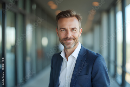 portrait of successful businessman consultant looking at camera and smiling inside modern office building