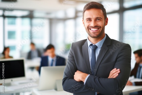 portrait of successful senior businessman consultant looking at camera and smiling inside modern office building