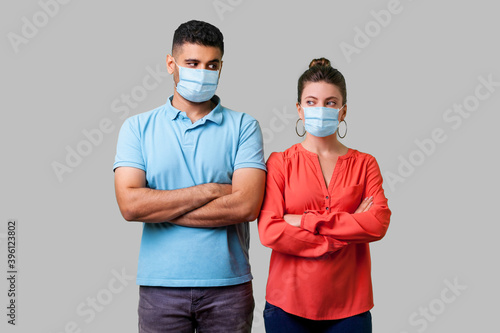 Portrait of upset couple with surgical medical mask standing together with crossed hands, looking sideways at each other with resentful glance, suspicion. isolated on gray background, indoor studio