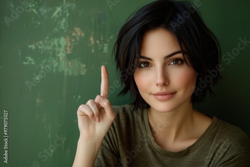 Portrait of woman with short hairstyle directing at blank logo space on green background while wearing oversize t-shirt
