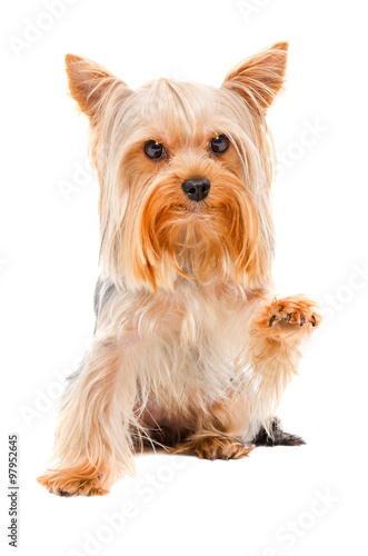 Portrait of Yorkshire terrier sitting with a raised paw
