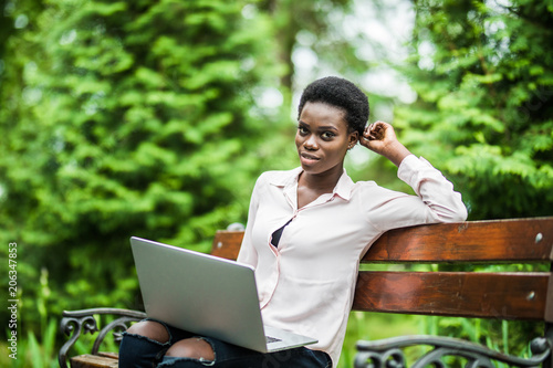 Portrait of young african american woman with afro hairstyle sitting on the wooden bench outdoor and working on laptop