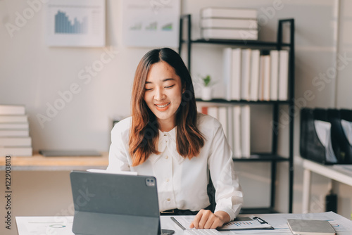 Portrait of young asian woman working with laptop at home office.