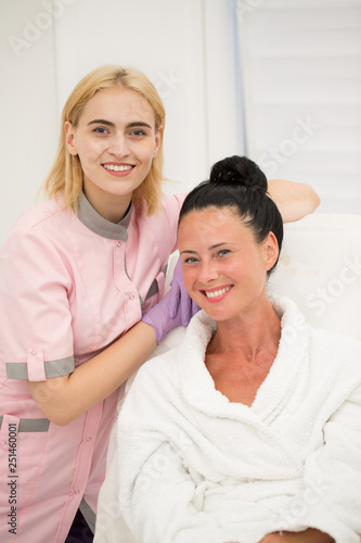 Portrait of young female cosmetologist and beautiful smiling patient during procedure in beauty parlor. Satisfied brunette in white robe sitting and professional doctor in uniform standing aside.
