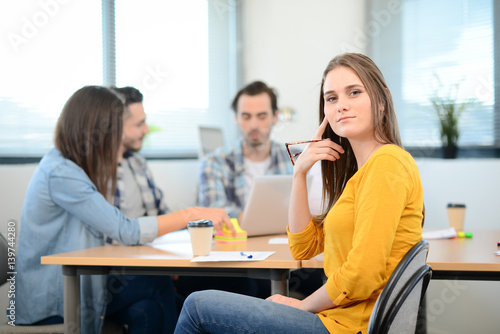 portrait of young woman in casual wear working in a creative business startup company office with coworker people in background