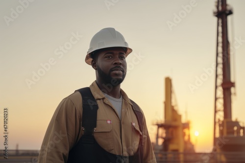 Portrait serious professional African American ethnic man male oilman worker engineer uniform hardhat helmet looking distance oil pump field. Industrial blurred background mining business technology
