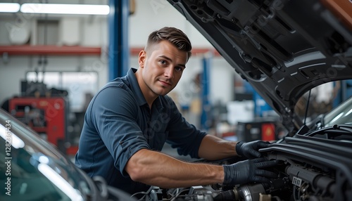 Portrait Shot of a Handsome Mechanic Working on a Vehicle in a Car Service.