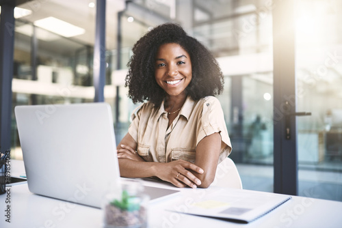 Portrait, smile and black woman in office with laptop, business plan and confidence for growth. About us, support and happy consultant with opportunity, folder and online project at digital agency
