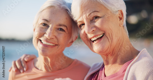 Portrait, yoga and senior women on the beach together as friends for a mental health workout by the ocean. Fitness, wellness and smile with old people at the sea for pilates training in nature