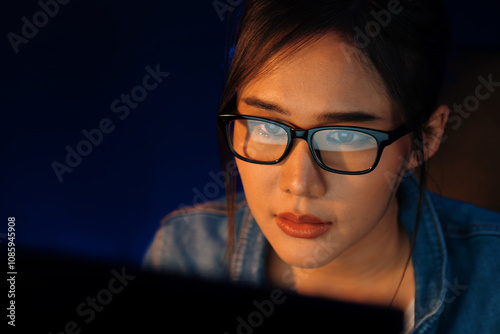 Portrait young beautiful Asian creative with glasses of serious face looking on pc to search project creator social media online, planning strategy creator at neon modern office at night. Stratagem.