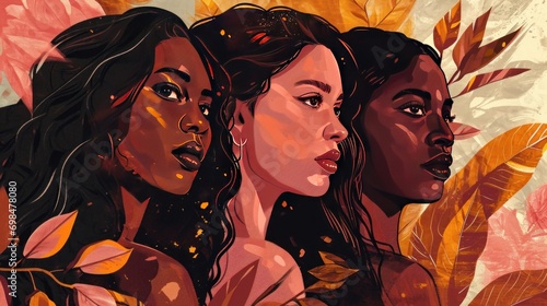 Portraits of three women against a backdrop of painterly autumn leaves, showcasing beauty in diversity with warm, rich tones.