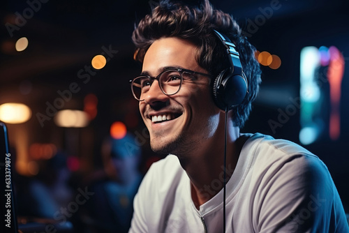 Positive emotions. Man in glasses is sitting by the laptop in dark room with neon lighting.