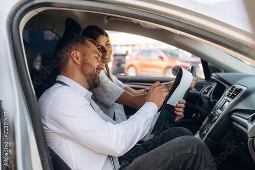 Positive mood, smiling. Woman is with instructor in car, driving school concept
