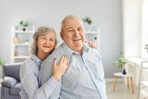 Positive portrait of an elderly family Caucasian couple, husband and wife, smiling at the camera at home. This tender relationships captures their happiness, bonding, and togetherness.