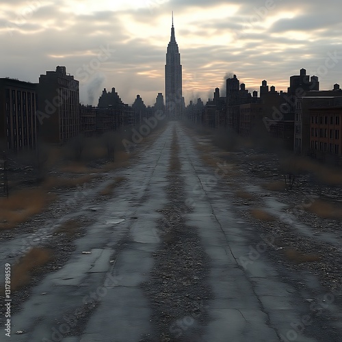 Post-apocalyptic city street, skyscraper, dawn, deserted, game