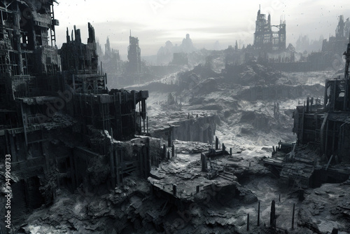 Post-Apocalyptic Cityscape: Crumbling Ruins in a Desolate Landscape