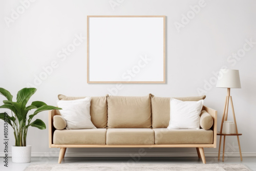 Poster mockup in modern scandinavian living room interior with sofa. Frame mock up