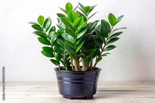 Pot with Zamioculcas Home Plant on White Background, Ideal for Urban Exploration Photography and Minimalist Interior Decor, Showcasing Greenery in Modern Living Spaces