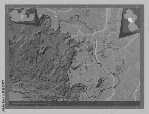 Potaro-Siparuni, Guyana. Grayscale. Major cities