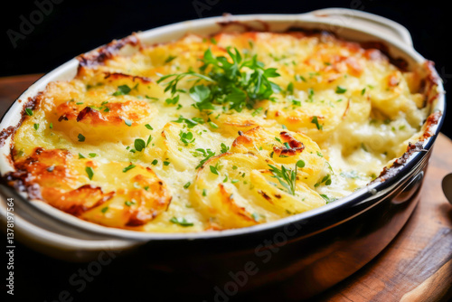 Potato gratin with golden, crispy edges and creamy layers of perfectly baked potatoes. Topped with fresh herbs, it offers inviting texture and savory flavor, making it perfect side dish
