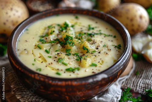 Potato leek soup in wooden bowl with rustic composition