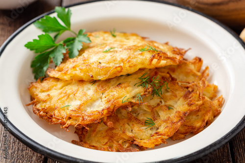 Potato pancakes or latkes or draniki in plate on dark wooden table. Selective focus.