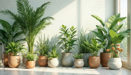 potted plant collection with diverse textures and colors for interior design inspiration with copy space