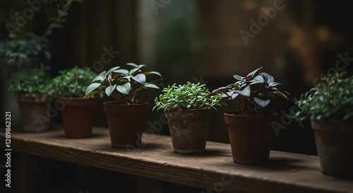 Potted plants on shelf, indoor garden concept, quiet contemplation art