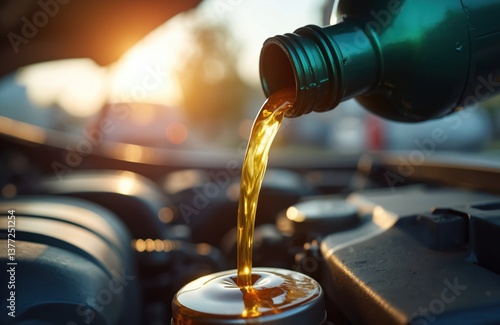 Pouring fresh oil into a car engine during maintenance. Automotive service, fuel concept. Maintenance, repair, and vehicle care. Lubrication of engine parts during oil change.
