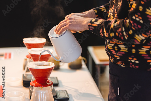 Pouring water over into a coffee pot.