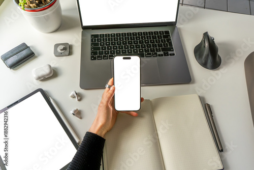 POV creative office mockup with empty smartphone screen for app design. Minimalistic desk, open bullet point notebook, ergonomic mouse, smart ring and digital devices.