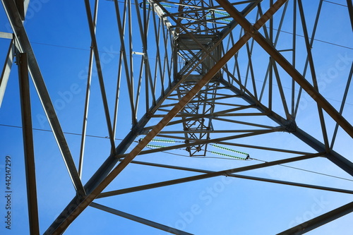 Power transmission tower close-up. Geometric, silhouette. Blue sky at the background.