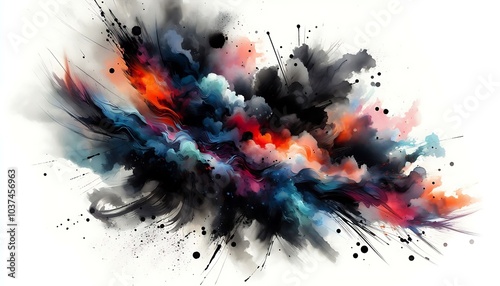 Powerful black ink brush strokes with vibrant, dynamic splashes watercolor for striking abstract design