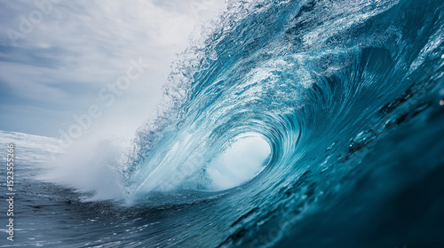Powerful ocean wave curling and crashing with dynamic energy under cloudy sky.