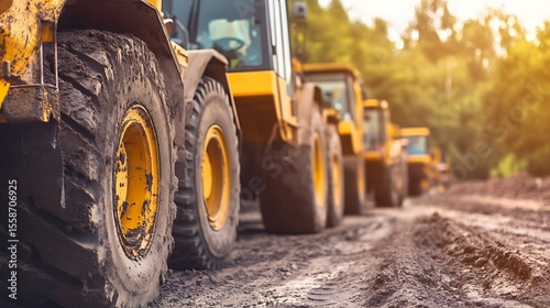 Powerful yellow construction machines aligned on site, waiting to begin heavy-duty earthwork operations