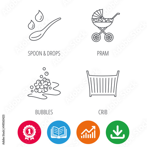 Pram carriage, spoon and drops icons. Bubbles, crib bed linear signs. Award medal, growth chart and opened book web icons. Download arrow. Vector