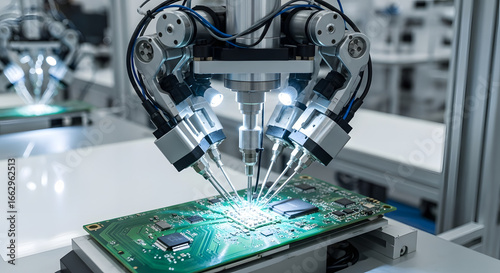 Precision Robotic Arm Assembling Circuit Board in Automated Electronics Manufacturing