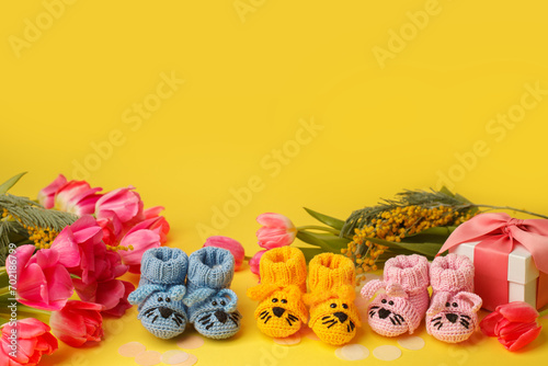 Pregnancy motherhood perenthood concept, Three colorful pairs of baby booties, gift box, tulips on yellow background, baby shower, first birthday party banner, handmade socks, mother mom