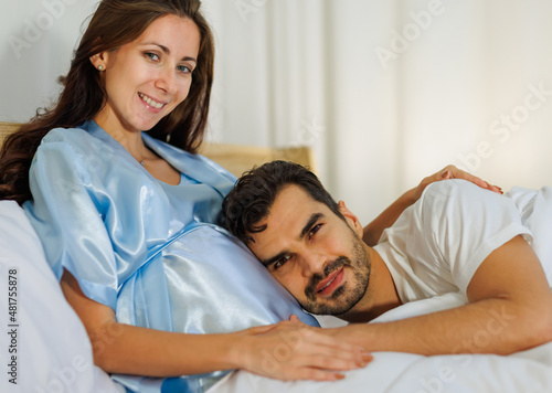 Pregnant wife resting on bed at night and smile as happy that beloved husband care her maternity by tenderly lying down on belly of unborn baby to listen child kicking