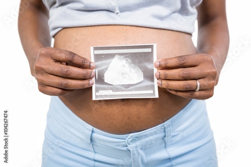 Pregnant woman holding ultrasound scan