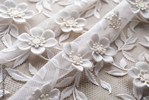 Premium 3D Floral Embossed Mesh Fabric – Side-Lit Detailed Fashion Material on White Background