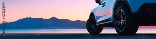 premium crossover suv at dusk, oceanfront location, low angle shot focusing on wheel detail, radiant evening sky, mountain range backdrop, pristine automotive styling, ambient lighting,
