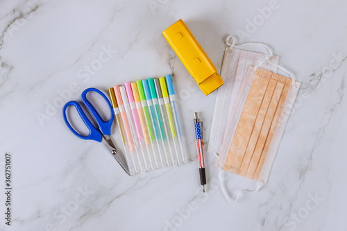 Prepare to school. Scissors, pens and face mask on white table.