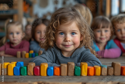 Preschoolers engage in educational play with colorful wooden toys under teacher's guidance. Learning through play concept.