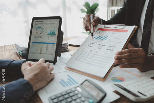 Presenting market reports, Meeting to summarize the financial condition of the company, Sit and discuss various reports in the conference room together, meeting idea.