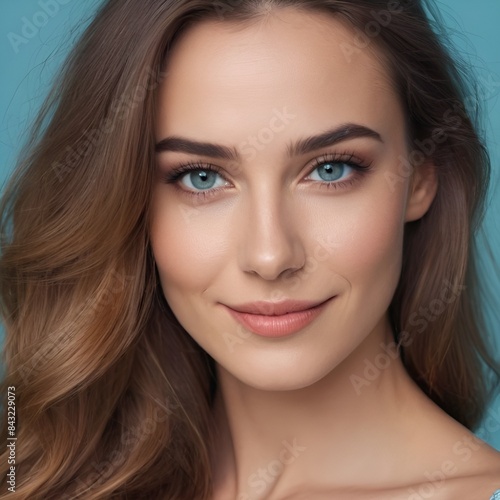 Pretty european beauty woman long hair with makeup glowing face and healthy facial skin portrait smile on isolated light blue background