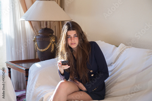 Pretty young caucasian brunette girl with blue eyes watching television in the living room of her house. She is switching channels with the remote control.
